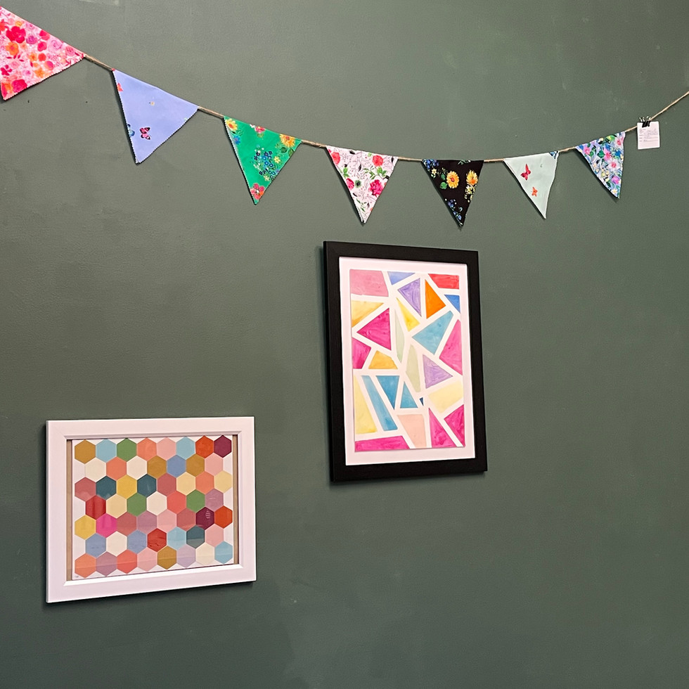 Add a colorful touch to your home décor with this charming 9-foot fabric banner. Each triangle flag is handcrafted in various colors and floral patterns including green, soft green purple, lavender, white, bright and soft pink, and black Strung on rustic twine, this garland brings a cozy, handmade feel to mantels, doorways, or classrooms