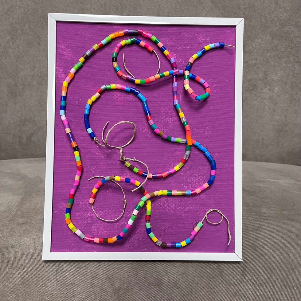A playful swirl of color and movement, this 8×10 framed piece features vibrant beads carefully strung on twine and arranged with joyful freedom. Full of texture and personality, it celebrates creativity, exploration, and the beauty of imperfection.