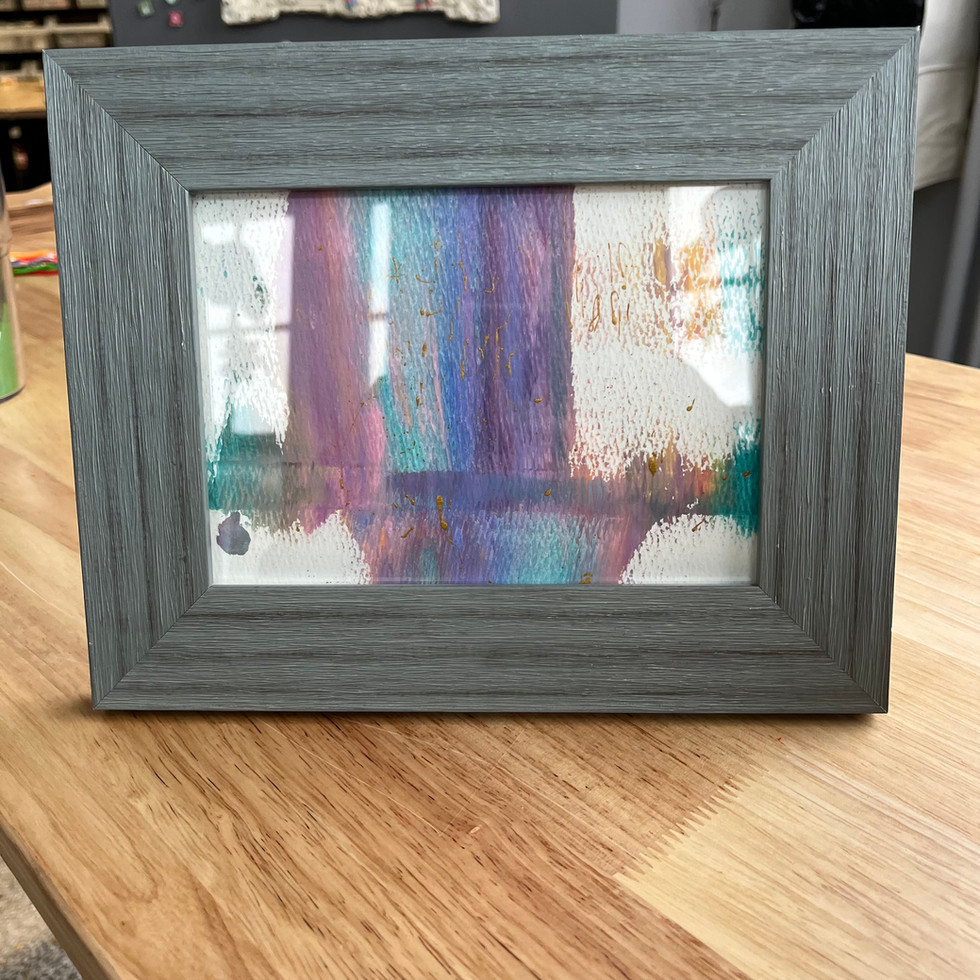 This framed squeegee art piece is a beautiful blend of soft muted colors and bold movement. The abstract design features flowing layers of muted purple, deep dark teal, warm rose, and shimmering gold. Each swipe and blend of color is completely one of a kind, making this piece a truly unique work of art.